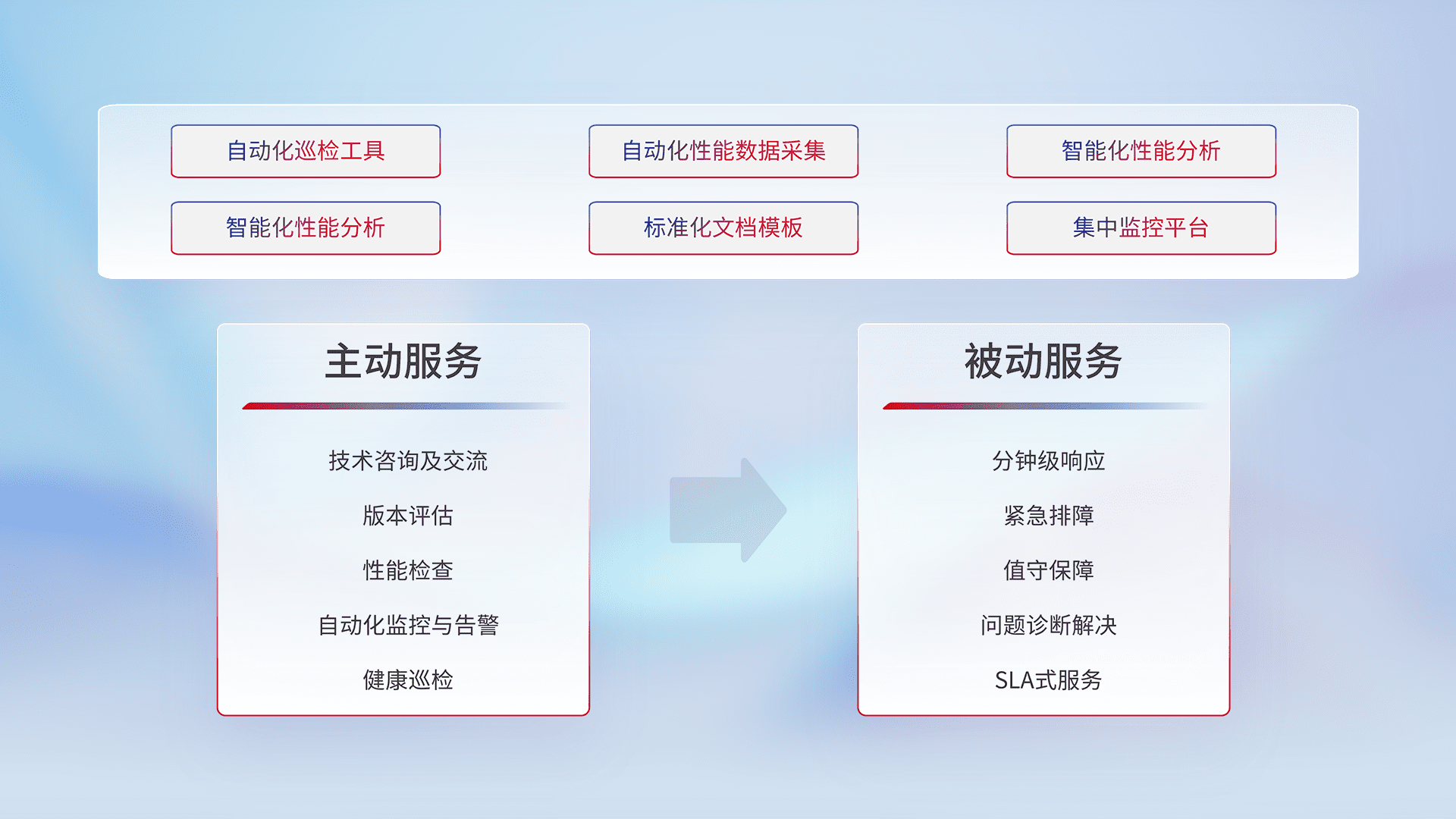 智能化工具和标准化文档,,,,保障服务质量,,提供主动服务(包含技术咨询、、、版本评估、、、性能检查、、、、自动化监控与告警、、健康巡检)和被动服务包含(分钟级响应、、、、紧急排障、、值守保障、、问题诊断解决、、、、SLA服务)。。。